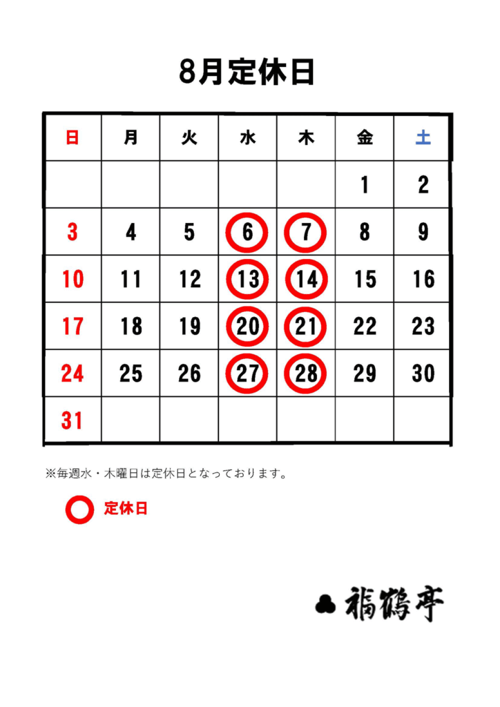 福鶴亭 8月定休日のお知らせ